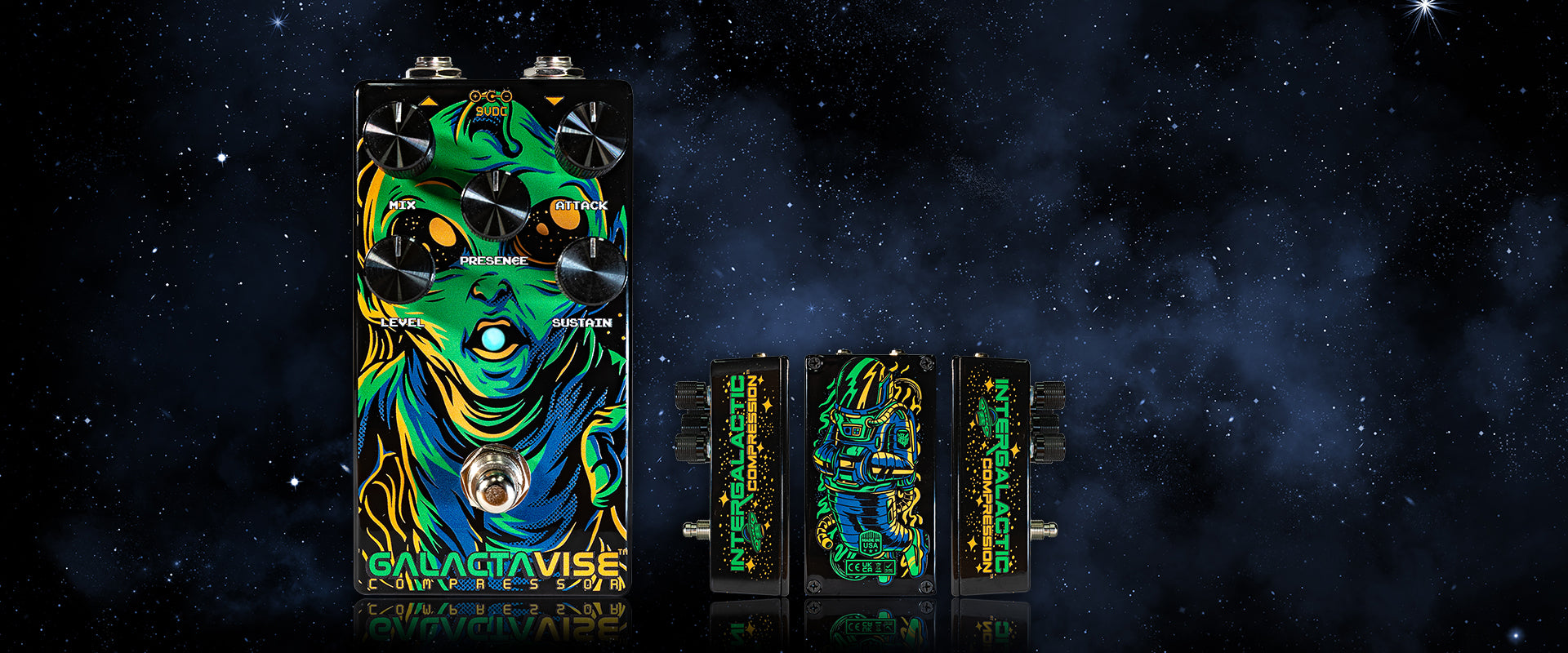 If you're looking for a top-notch compressor pedal to add to your collection, check out our Galactavise™ Compressor. This flagship compressor is built with the musician's needs in mind and boasts an uncompromisingly sweet compressor circuit with a "mix" control for dialing in that perfect balance of compressed tone and clean tone. The top end can often be make or break with many compressor circuits, so AllPedal also added the ability to adjust just the right amount with the "presence" control. The Galactavise™ uses the highest quality components for a low noise floor and road-worthy durability. Let the Galactavise™ blast your tone into orbit!